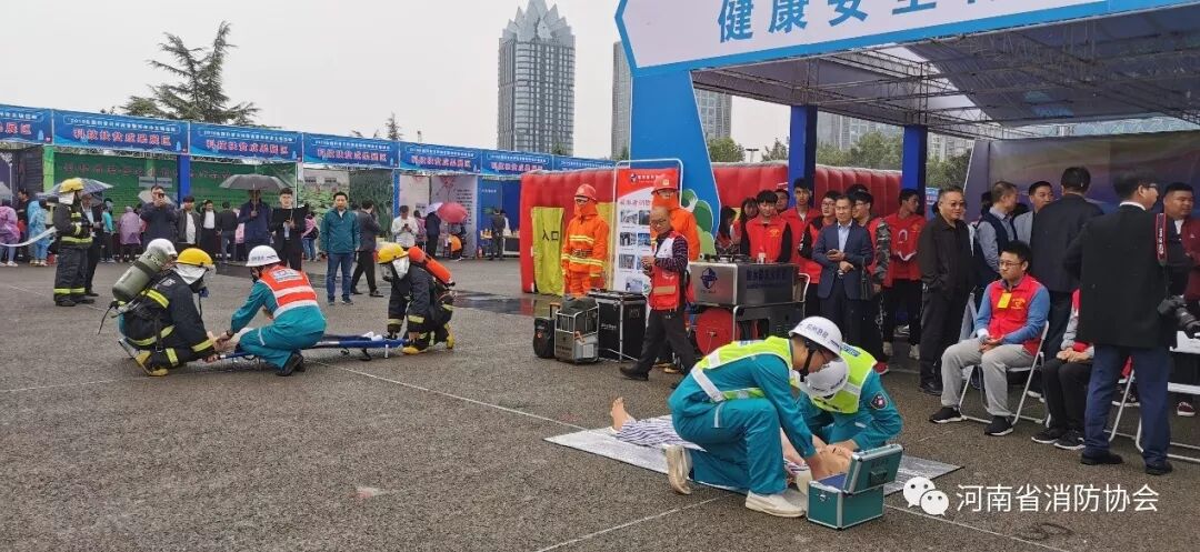 本次活动主题为“敬畏生命 智慧消防 应急救护”,由河南省消防协会、河南省人民医院、河南省红十字会主办,河南省消防协会科学教育工作委员会、河南省消防协会宣传培训专业委员会、河南省人民医院、河南省红十字培训中心承办,河南消防职业培训学校消防安全教育基地、河南浩福莱科技有限公司消防安全教育基地、华北水利水电大学、郑州轻工业大学、河南理工大学、郑州大学、中原工学院、郑州航空工业管理学院、河南工程学院、河南城建学院、安阳工学院、洛阳理工学院、郑州市金水区红十字会风马旗应急救援志愿者服务队、河南福尔盾消防科技有限公司、河南九源教育科技有限公司协办,进行了消防逃生、心肺复苏、创伤包扎、科学用眼等演示和体验,做了心脑血管等疾病现场义诊,免费赠阅了科普图书和资料,提供消防逃生帐篷供参观者亲身体验,并进行了消防和救护联动的大型现场模拟演练。